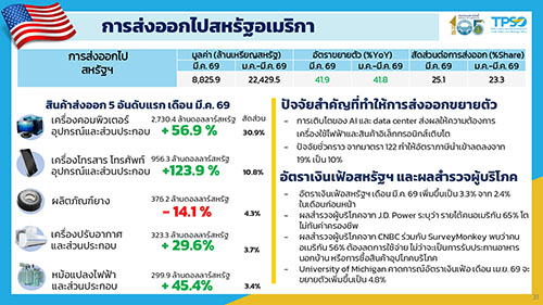 ทั้งนี้ การส่งออก 3 เดือนแรกของปี 2569 ขยายตัวที่ร้อยละ 17.6 หากหักสินค้าเกี่ยวเนื่องกับน้ำมัน ทองคำ และยุทธปัจจัย ขยายตัวที่ร้อยละ 17.0
