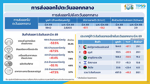 ขณะที่สินค้าสำคัญที่หดตัว อาทิ ยางพารา หดตัวร้อยละ 21.6 หดตัวต่อเนื่อง 11 เดือน (หดตัวในตลาดจีน สหรัฐฯ และบราซิล แต่ขยายตัวในตลาดมาเลเซีย ญี่ปุ่น และเวียดนาม) อาหารทะเลกระป๋องและแปรรูป หดตัวร้อยละ 2.0 หดตัวต่อเนื่อง 3 เดือน (หดตัวในตลาดซาอุดีอาระเบีย อิสราเอล และเกาหลีใต้ แต่ขยายตัวในตลาดสหรัฐฯ ญี่ปุ่น และออสเตรเลีย) ผลิตภัณฑ์มันสำปะหลัง หดตัวร้อยละ 17.2 หดตัวต่อเนื่อง 9 เดือน (หดตัวในตลาดจีน สหรัฐฯ และมาเลเซีย แต่ขยายตัวในตลาดญี่ปุ่น ไต้หวัน และเกาหลีใต้) เครื่องดื่ม หดตัวร้อยละ 5.9 หดตัวต่อเนื่อง 2 เดือน (หดตัวในตลาดจีน สหรัฐฯ และอินเดีย แต่ขยายตัวในตลาดเวียดนาม เมียนมา และลาว) ไก่สดแช่เย็นแช่แข็ง หดตัวร้อยละ 30.0 หดตัวต่อเนื่อง 3 เดือน (หดตัวในตลาดญี่ปุ่น จีน และสหรัฐอาหรับเอมิเรตส์ แต่ขยายตัวในตลาดมาเลเซีย เกาหลีใต้ และฮ่องกง) และเนื้อสัตว์และของปรุงแต่งที่ทำจากเนื้อสัตว์ หดตัวร้อยละ 22.8 หดตัวต่อเนื่อง 12 เดือน (หดตัวในตลาดญี่ปุ่น สหราชอาณาจักร และเมียนมา แต่ขยายตัวในตลาดลาว ฮ่องกง และเยอรมนี) ทั้งนี้ 3 เดือนแรกของปี 2569 การส่งออกสินค้าเกษตรและอุตสาหกรรมเกษตร หดตัวร้อยละ 2.1