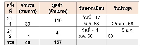 ทั้งนี้ ผู้สนใจเข้าร่วมประมูลสามารถลงทะเบียนและยื่นซองประมูล พร้อมเอกสารประกอบการประมูลที่กำหนด โดยทรัพย์เพื่อที่อยู่อาศัยและเพื่อการลงทุน ราคาไม่เกิน 20 ลบ. (ครั้งที่ 21.1/2568) ภายในวันที่ 17 พ.ย. 2568 และกำหนดเปิดซองประมูลวันที่ 25 พ.ย. 2568 ส่วนทรัพย์ที่มีราคาสูงกว่า 20 ลบ. (ครั้งที่ 21.2/2568) ภายในวันที่ 1 ธ.ค. 2568 และกำหนดเปิดซองประมูลวันที่ 9 ธ.ค. 2568 เวลา 10.00 น. เป็นต้นไป ที่สำนักงานใหญ่ SAM อาคารซันทาวเวอร์ส ถ.วิภาวดีรังสิต กรุงเทพฯ