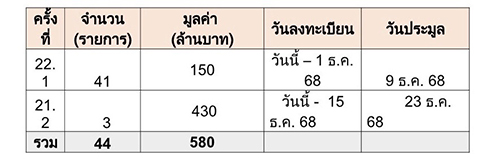 ทั้งนี้ ผู้สนใจเข้าร่วมประมูลสามารถลงทะเบียนและยื่นซองประมูล พร้อมเอกสารประกอบการประมูลที่กำหนดโดยทรัพย์เพื่อที่อยู่อาศัยและเพื่อการลงทุน ราคาไม่เกิน 20 ลบ. (ครั้งที่ 22.1/2568) ภายในวันที่ 1 ธ.ค. 2568 และกำหนดเปิดซองประมูลวันที่ 9 ธ.ค. 2568 ส่วนทรัพย์ที่มีราคาสูงกว่า 20 ลบ. (ครั้งที่ 22.2/2568) ภายในวันที่ 15 ธ.ค. 2568 และกำหนดเปิดซองประมูลวันที่ 23 ธ.ค. 2568 เวลา 10.00 น. เป็นต้นไป ที่สำนักงานใหญ่ SAM อาคารซันทาวเวอร์ส ถ.วิภาวดีรังสิต กรุงเทพฯ