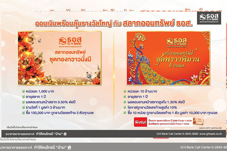 1.สลากออมทรัพย์ ธอส. ชุดทองกวาวมั่งมี: หน่วยละ 1,000 บาท กรอบวงเงิน 20,000 ล้านบาท อายุสลาก 1 ปี ผลตอบแทนหน้าสลาก 0.50% ต่อปี ออกรางวัลทุกเดือนตลอด 12 งวด รางวัลที่ 1 มูลค่ารางวัลสูงถึง 3 ล้านบาท จำนวน 1 รางวัล รางวัลข้างเคียงรางวัลที่ 1 มูลค่ารางวัลละ 50,000 บาท จำนวน 2 รางวัล รางวัลที่ 2 มูลค่ารางวัลละ 10,000 บาท จำนวน 10 รางวัลต่อหมวด รางวัลเลขท้าย 3 ตัว รางวัลละ 100 บาท (หมุน 1 ครั้ง) จำนวน 20,000 รางวัล และรางวัลเลขท้าย 2 ตัว รางวัลละ 50 บาท (หมุน 1 ครั้ง) จำนวน 200,000 รางวัล ซื้อ 100,000 บาท การันตีถูกรางวัลเลขท้าย 2 ตัวทุกงวด รับผลตอบแทนขั้นต่ำ 1.10% ต่อปี หากซื้อ 1,000,000 บาท การันตีถูกรางวัลเลขท้าย 2 ตัว และเลขท้าย 3 ตัวทุกงวด รับผลตอบแทนขั้นต่ำ 1.22% ต่อปี ซื้อสลากออมทรัพย์ ธอส. ชุดทองกวาวมั่งมี ตั้งแต่วันที่ 2 – 12 ธันวาคม 2568 วงเงินตั้งแต่ 100,000 บาท ขึ้นไป จะได้รับบัตรชมภาพยนตร์ MAJOR CINEPLEX มูลค่า 260 บาท หรือจนกว่าของสมนาคุณจะหมด (จำนวน 1 ท่าน ต่อ 1 ใบ)