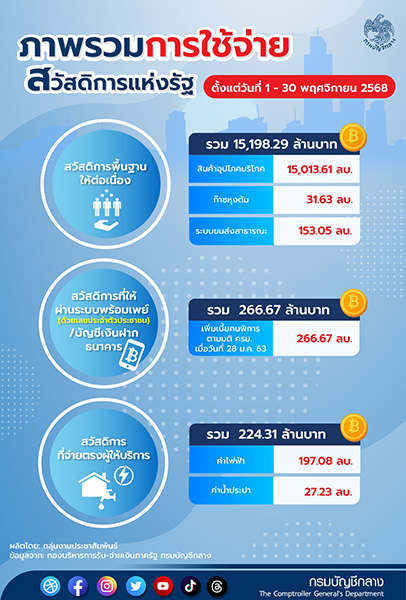 นอกจากนี้ กรมบัญชีกลางขอรายงานผลการจ่ายเงินสวัสดิการแห่งรัฐ ที่จ่ายให้กับร้านธงฟ้าราคาประหยัดพัฒนาเศรษฐกิจท้องถิ่นและร้านค้าอื่น ๆ ที่กระทรวงพาณิชย์กำหนด ร้านก๊าซหุงต้ม ผู้ให้บริการระบบขนส่งสาธารณะ  ผู้ให้บริการไฟฟ้าและน้ำประปา ซึ่งเป็นข้อมูลตั้งแต่วันที่ 1 – 30 พฤศจิกายน 2568 ดังนี้