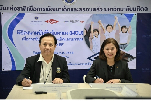 สถาบันแห่งชาติเพื่อการพัฒนาเด็กและครอบครัว มหาวิทยาลัยมหิดล และกลุ่มบริษัท ดาว ประเทศไทย (Dow) ร่วมลงนามบันทึกข้อตกลงความร่วมมือทางวิชาการ (MOU) เพื่อยกระดับการพัฒนาเด็กไทยผ่านทักษะสมอง Executive Functions (EF) ซึ่งเป็นรากฐานสำคัญของการเรียนรู้ การคิดวิเคราะห์ การควบคุมตนเอง และความยืดหยุ่นในการเผชิญปัญหาในศตวรรษที่ 21 ณ สถาบันแห่งชาติเพื่อการพัฒนาเด็กและครอบครัว