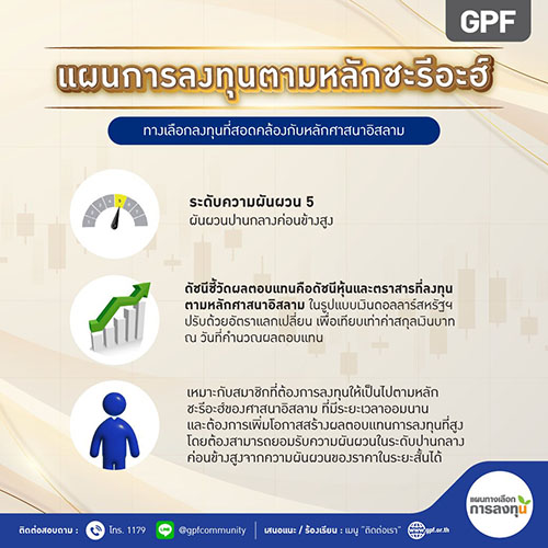 โดยแผนการลงทุนตามหลักชะรีอะฮ์ ออกแบบให้สอดคล้องกับหลักชะรีอะฮ์อย่างเคร่งครัด พร้อมมุ่งสร้างผลตอบแทนระยะยาวอย่างยั่งยืน มีการลงทุนในตราสารทุนและหน่วยลงทุนที่เป็นไปตามหลักชะรีอะฮ์ไม่เกิน 60% เช่น หุ้นชารีอะฮ์ และส่วนที่เหลือไม่น้อยกว่า 40% ลงทุนในตราสารหนี้หรือสินทรัพย์ที่ได้รับอนุญาต เช่น ตราสารศุกูก มีการบริหารสภาพคล่องด้วยเงินฝากระยะสั้นตามความเหมาะสม แผนนี้เหมาะสำหรับสมาชิกที่ต้องการลงทุนตามหลักศาสนาอิสลาม หรือสมาชิกที่เข้าใจความเสี่ยง และพร้อมรับความผันผวนในระยะสั้น เพื่อโอกาสสร้างผลตอบแทนที่ดีในระยะยาว