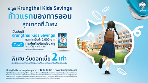 สำหรับโปรโมชันพิเศษ ต้อนรับวันเด็ก ปี 2569 เปิดบัญชี Krungthai Kids Savings รับสิทธิประโยชน์โบนัสเพิ่ม 1 เท่า จากอัตราดอกเบี้ยปกติ (รวมเป็น 2 เท่า) เมื่อมียอดเงินฝากมากกว่ายอดถอนในเดือนก่อนหน้า เพื่อส่งเสริมพฤติกรรมการออมอย่างต่อเนื่อง และรับฟรี กระปุกรักษ์โลก “น้องวายุ” เมื่อเปิดบัญชีและมียอดฝากขั้นต่ำ 2,000 บาท ตั้งแต่วันที่ 10 มกราคม 2569 – 31 มีนาคม 2569 หรือจนกว่ากระปุกจะหมด