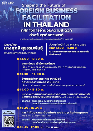 การสัมมนา ‘Shaping the Future of Foreign Business Facilitation in Thailand : ทิศทางการอำนวยความสะดวกสำหรับธุรกิจต่างชาติ ภายใต้พระราชบัญญัติการประกอบธุรกิจของคนต่างด้าว พ.ศ. 2542’ ที่จะจัดขึ้นในวันพฤหัสบดีที่ 29 มกราคม 2569 ณ ห้อง Richmond Ballroom 2-3 ชั้น 6 โรงแรมแกรนด์ ริชมอนด์ สไตลิช คอนเวนชั่น จ.นนทบุรี พร้อมเปิดกว้างให้นักธุรกิจทั้งชาวไทยและต่างชาติเข้าร่วมสัมมนาฯ โดยผู้สนใจสามารถสมัครเข้าร่วมงานฯ ได้ทางเว็บไซต์ https://forms.gle/mJmEpCux3iLhSQYU9 ฟรี!! ไม่มีค่าใช้จ่าย โดยเปิดรับสมัครตั้งแต่วันนี้เป็นต้นไป และขอสงวนสิทธิ์ปิดรับสมัครเมื่อจำนวนที่นั่งครบตามจำนวน” อธิบดีพูนพงษ์ กล่าวทิ้งท้าย