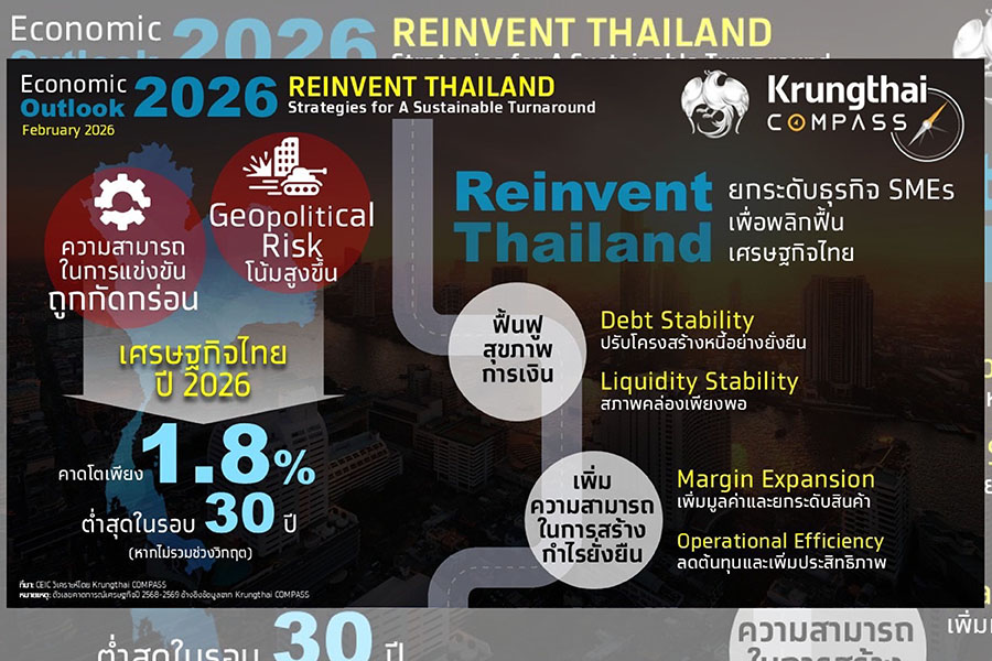 Krungthai COMPASS ประเมินเศรษฐกิจไทยในปี 2569 ขยายตัวเพียง 1.8% ต่ำกว่า 2% ครั้งแรกในรอบ 30 ปี ชี้ SMEs ติดหล่มเชิงโครงสร้าง ต้องเร่งปรับโมเดลธุรกิจ สร้างมูลค่าเพิ่มและเจาะตลาดเฉพาะทาง ภายใต้แนวคิด Reinvent Thailand เพื่อฟื้นเสาหลักเศรษฐกิจไทยอย่างยั่งยืน