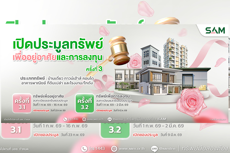 ทั้งนี้ ใน 2569 นี้ SAM ยังคงมุ่งเน้นการเป็นกลไกสำคัญในการบริหารจัดการสินทรัพย์เพื่อขับเคลื่อนเศรษฐกิจของประเทศ โดยการเปิดประมูลในครั้งนี้ได้คัดเลือกทรัพย์มือสองที่มีศักยภาพสูง ตั้งอยู่บนทำเลเด่นทั่วประเทศ มานำเสนอให้กับผู้ที่กำลังมองหาที่อยู่อาศัยและนักลงทุนที่ต้องการขยายธุรกิจ