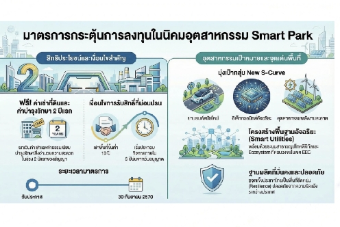 กนอ. เดินหน้ายกระดับขีดความสามารถในการแข่งขันของประเทศ เปิดตัวมาตรการส่งเสริมการเช่าที่ดินในนิคมอุตสาหกรรม Smart Park ครั้งใหม่ มุ่งเป้าดึงดูดกลุ่มอุตสาหกรรมเทคโนโลยีขั้นสูง (New S-Curve) และนักลงทุนที่มองหาฐานการผลิตที่มีความมั่นคงท่ามกลางสถานการณ์ภูมิรัฐศาสตร์โลก