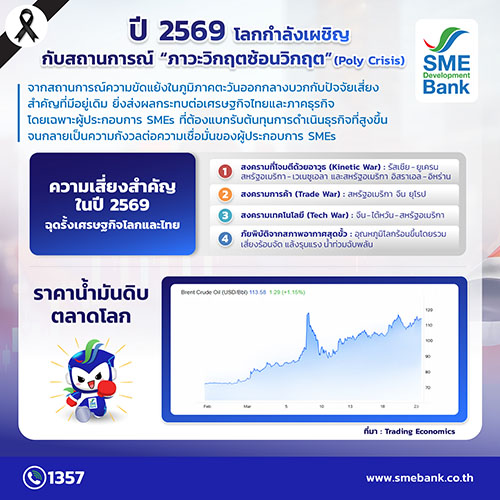 SME D Bank เผยดัชนีเชื่อมั่นเอสเอ็มอีไตรมาส 1/69 ร่วงเหลือ 50.2 เหตุกังวลราคาพลังงานพุ่ง กระทบต้นทุน–คำสั่งซื้อ เดินหน้ามาตรการช่วยเต็มกำลัง ปล่อยสินเชื่อดอกเบี้ยต่ำ 3% หนุนธุรกิจลดต้นทุน ปรับสู่พลังงานสะอาด เสริมแกร่งแข่งขันระยะยาว