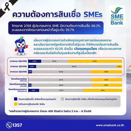 ขณะที่ คาดการณ์ 3 เดือนข้างหน้า หรือไตรมาส 2/69 ผู้ประกอบการเอสเอ็มอี มีความต้องการสินเชื่อ 66.2% ชะลอลงจากไตรมาสก่อนหน้าที่อยู่ระดับ 93.7% เนื่องจากผู้ประกอบการส่วนใหญ่รอดูสถานการณ์ของสงคราม และนโยบายภาครัฐหลังการจัดตั้งรัฐบาล ทำให้ความต้องการสินเชื่อของเอสเอ็มอีกว่า 62.2% ยังเป็นเงินทุนหมุนเวียน เพื่อประคองสภาพคล่องและรับมือกับต้นทุนพลังงานที่สูงขึ้นเป็นหลัก