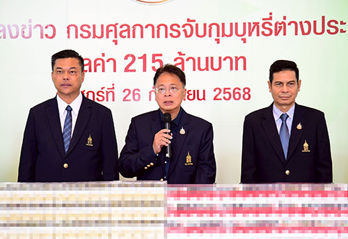 เมื่อช่วงสายวานนี้ (26 กันยายน 2568) ณ ห้องโถง อาคาร 1 ชั้น 1 กรมศุลกากร (คลองเตย), นายธีรัชย์ อัตนวานิช อธิบดีกรมศุลกากร พร้อมด้วย นายดิเรก คชารักษ์ และ นายคณิต มีปิด รองอธิบดีกรมศุลกากร รวมถึง คณะผู้บริหารกรมศุลกากร ร่วมแถลงผลการจับกุมบุหรี่ต่างประเทศละเมิดเครื่องหมายการค้า มูลค่าความเสียหายทางเศรษฐกิจ 215 ล้านบาท