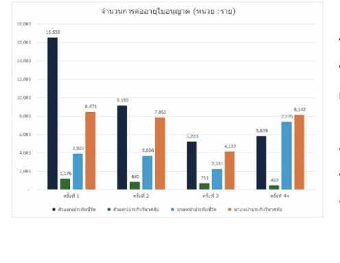 ทั้งนี้ จากสถิติการขอรับและต่ออายุใบอนุญาตตัวแทน-นายหน้าประกันภัย ในช่วง 6 เดือนแรกของปี 2568 (มกราคม – มิถุนายน 2568) พบว่า มีผู้ยื่นคําขอรับ และต่ออายุใบอนุญาต รวมทั้งสิ้นจํานวน 129,606 ราย เพิ่มขึ้น +944 รายจากช่วงเวลาเดียวกันของปีก่อน คิดเป็น 0.73% แบ่งเป็นการขอรับใบอนุญาตใหม่ จํานวน 46,987 ราย ประกอบด้วย ตัวแทนประกันชีวิตจํานวน 32,907 ราย ตัวแทนประกันวินาศภัยจํานวน 1,474 ราย นายหน้าประกันชีวิตจํานวน 5,499 ราย และนายหน้าประกันวินาศภัยจํานวน 7,107 ราย การต่ออายุใบอนุญาตของตัวแทนและนายหน้าประกันภัย รวมทั้งสิ้น 85,807 ราย