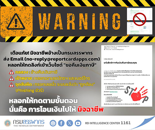 กรมสรรพากร เตือนภัยด่วนที่สุด! มิจฉาชีพอ้างเป็นกรมสรรพากร ส่ง Email (no-reply@reportcardapps.com) หลอกให้กดลิงก์เข้าเว็ปไซต์ “ขอคืนเงินภาษี” อ้างคืนเงินภาษี หลอกเอาเลขบัตรประชาชนและเบอร์โทรศัพท์