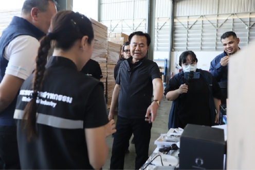 “ผม พร้อมด้วย นางสาวภาดาท์ วรกานนท์ ที่ปรึกษารัฐมนตรีช่วยว่าการกระทรวงอุตสาหกรรม นายพีรวัส สมวงศ์ เลขานุการรัฐมนตรีช่วยว่าการกระทรวงอุตสาหกรรม และ นายเอกนิติ รมยานนท์ เลขาธิการ สมอ. จึงได้ลงพื้นที่เข้าตรวจสอบคลังสินค้าทั้ง 3 แห่งในจังหวัดสมุทรปราการ แห่งแรกเป็นคลังสินค้าแบบฟูลฟีลเม้นท์ (Fulfillment) ใน อ.บางพลี จ.สมุทรปราการ ที่ให้บริการแบบครบวงจรตั้งแต่ รับออเดอร์ จัดเก็บสินค้าในคลัง แพ็คสินค้า ไปจนถึงจัดส่งถึงมือลูกค้า โดยตรวจพบเครื่องใช้ไฟฟ้าที่ไม่มีเครื่องหมาย มอก. เช่น เครื่องนวดไฟฟ้า ที่ม้วนผมไฟฟ้า เเบตเตอรี่ ไฟเส้นแอลอีดี หลอดไฟแอลอีดี และหม้อแปลงไฟฟ้า จำนวนกว่า 35,000 ชิ้น รวมมูลค่ากว่า 16 ล้านบาท จึงได้ยึดอายัดสินค้าไว้ทั้งหมด เพื่อดำเนินการตามกฎหมายต่อไป