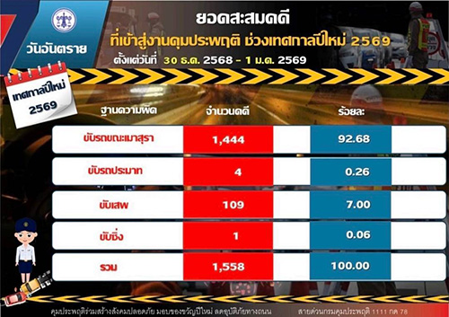 ขณะที่ยอดคดีสะสมตลอด 3 วัน (30 ธันวาคม 2568 – 1 มกราคม 2569) รวมทั้งสิ้น 1,558 คดี แบ่งเป็น…