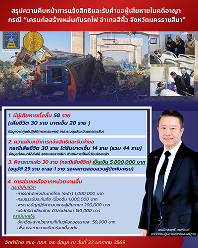 กรมคุ้มครองสิทธิฯ ร่วมกับ สนง.ยุติธรรมโคราช เร่งให้การช่วยเหลือเหยื่อเครนถล่มทับรถไฟ จ.นครราชสีมา อนุมัติจ่าย 29 ราย รวมเป็นเงิน 5.8 ล้านบาท