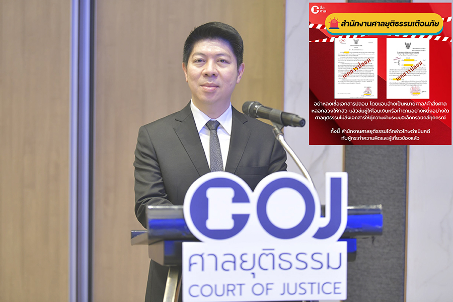 วันที่ 6 ก.พ.2569 นายสุริยัณห์ หงษ์วิไล โฆษกศาลยุติธรรม กล่าวว่า สำนักงานศาลยุติธรรมขอฝากเตือนประชาชน โปรดอย่าหลงเชื่อมิจฉาชีพ ส่งเอกสารปลอมแอบอ้างเป็นหมายศาล หรือคำสั่งศาล ผ่านระบบอิเล็กทรอนิกส์ต่างๆ เพื่อจะหลอกลวงให้โอนเงิน หรือทำตามอย่างหนึ่งอย่างใด