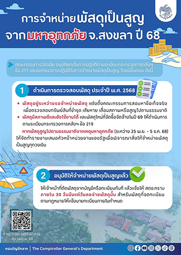 และการบริหารพัสดุภาครัฐ จึงอนุมัติยกเว้นการปฏิบัติตามระเบียบกระทรวงการคลังว่าด้วยการจัดซื้อจัดจ้างและการบริหารพัสดุภาครัฐ พ.ศ. 2560 ข้อ 217 และซ้อมความเข้าใจแนวทางปฏิบัติในการจำหน่ายพัสดุกรณีเกิดเหตุ มหาอุทกภัยในเขตท้องที่จังหวัดสงขลา โดยมีขั้นตอน ดังนี้