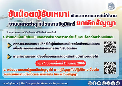 กรมบัญชีกลางเพิ่มเงื่อนไขคัดเลือกงานก่อสร้าง ผู้เสนอราคาต่ำสุดที่มีประวัติพลาดซ้ำในรอบ 2 ปี อาจถูกตัดสิทธิ์ พร้อมย้ำหน่วยงานรัฐใช้ดุลพินิจบอกเลิกสัญญาได้ หากงานบกพร่องกระทบชีวิตและทรัพย์สินประชาชน มีผล 2 มี.ค. 2569