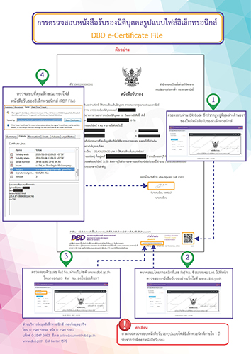 อธิบดีพูนพงษ์ฯ กล่าวต่อว่า “ขอเตือนประชาชนให้รู้เท่าทันกลโกงของมิจฉาชีพ โดยสามารถตรวจสอบความถูกต้องของหนังสือรับรองนิติบุคคลทั้งรูปแบบเอกสารและไฟล์อิเล็กทรอนิกส์ด้วยตนเองได้ 4 วิธี ดังนี้