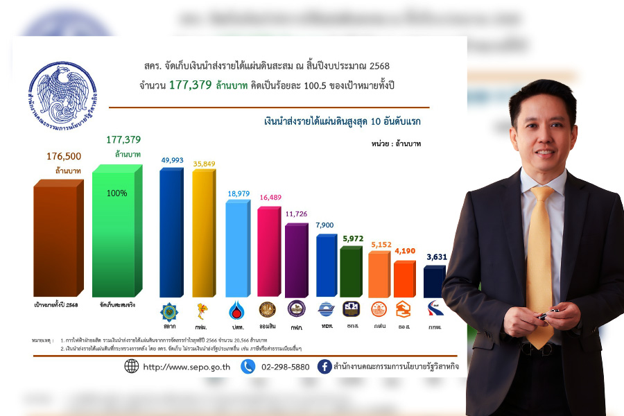 สคร. จัดเก็บเงินนำส่งรายได้แผ่นดินสะสม ณ สิ้นปีงบประมาณ 2568 จำนวน 177,379 ล้านบาท คิดเป็นร้อยละ 100.5% ของเป้าหมายทั้งปี เผย! 10 รัฐวิสาหกิจนำส่งรายได้แผ่นดินหรือเงินปันผลสูงสุด
