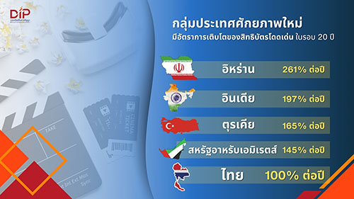 จาก บทวิเคราะห์ข้อมูลสิทธิบัตรทั่วโลกในรอบ 20 ปี พบว่า ประเทศที่ถือครองสิทธิบัตรในอุตสาหกรรมภาพยนตร์และสื่อบันเทิงมากที่สุด ได้แก่ จีน ญี่ปุ่น เกาหลีใต้ และสหรัฐอเมริกา ซึ่งเป็นศูนย์กลางของอุตสาหกรรมระดับโลก แต่ประเด็นที่น่าสนใจ คือ การก้าวขึ้นมาของกลุ่มประเทศศักยภาพใหม่ ที่มีอัตราการเติบโตของสิทธิบัตรอย่างโดดเด่น เช่น อิหร่าน (261% ต่อปี) อินเดีย (197% ต่อปี) ตุรเคีย (165% ต่อปี) สหรัฐอาหรับเอมิเรตส์ (145% ต่อปี) รวมถึง ไทย (100% ต่อปี) ขณะที่ หลายประเทศในอาเซียนมีแนวโน้มชะลอตัว เช่น อินโดนีเซีย มาเลเซีย ฟิลิปปินส์ และเวียดนาม บ่งชี้ถึงข้อจำกัดในการลงทุนด้าน R&D ความต่อเนื่องเชิงนโยบาย และการเคลื่อนย้ายฐานภาคอุตสาหกรรม