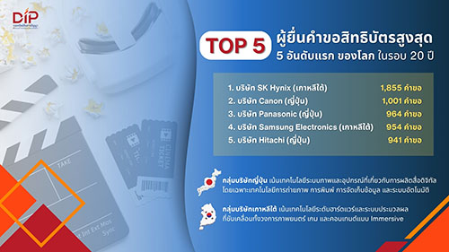 ทั้งนี้ เมื่อพิจารณาใน มิติของผู้ขับเคลื่อนนวัตกรรมในเวทีระดับโลก พบว่า องค์กรขนาดใหญ่มีการวางแผนด้านสิทธิบัตรอย่างเป็นระบบ และใช้ทรัพย์สินทางปัญญาเป็นเครื่องมือสร้างความได้เปรียบเชิงธุรกิจในระยะยาว โดย ผู้ยื่นคำขอสิทธิบัตรสูงสุด 5 อันดับแรกของโลก ได้แก่ บริษัท SK Hynix (เกาหลีใต้) 1,855 คำขอ ทิ้งห่างอันดับ 2 อย่างบริษัท Canon (ญี่ปุ่น) 1,001 คำขอ ตามมาด้วย บริษัท Panasonic (ญี่ปุ่น) 964 คำขอ บริษัท Samsung Electronics (เกาหลีใต้) 954 คำขอ และ บริษัท Hitachi (ญี่ปุ่น) 941 คำขอ