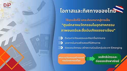 สำหรับ โอกาสและทิศทางของประเทศไทย แม้จำนวนสิทธิบัตรยังไม่สูงมากนัก แต่มีอัตราการเติบโตสูงต่อเนื่องในระยะ 10 ปีหลัง ประกอบกับคู่แข่งในอาเซียนมีจำกัด ทั้งนี้ กรมฯ มองว่า เป็นโอกาสสำคัญของไทยที่จะยกระดับบทบาทสู่การเป็นศูนย์กลางนวัตกรรมของภูมิภาคนี้ เนื่องจากไทยมีจุดแข็งหลายด้าน ทั้งต้นทุนทางวัฒนธรรมและศิลปะที่หลากหลาย สามารถต่อยอดให้เข้ากับเทคโนโลยี Immersive Media เช่น AR/VR หรือ Avatar เพื่อสร้างประสบการณ์ใหม่ในสื่อบันเทิงและท่องเที่ยว
