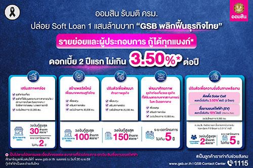 โดยมอบหมายให้ ธนาคารออมสิน เป็น “แกนหลัก” ในการขับเคลื่อนมาตรการทางการเงินเพื่อเติมสภาพคล่องผ่าน โครงการสินเชื่อดอกเบี้ยต่ำ (Soft Loan) “GSB พลิกฟื้นธุรกิจไทย” วงเงิน 100,000 ล้านบาท มุ่งช่วย ประชาชนและผู้ประกอบการ SMEs ปรับตัวรับมือวิกฤตที่ส่งผลกระทบต่อการดำรงชีวิตและการดำเนินธุรกิจ พร้อม สนับสนุนการเปลี่ยนผ่านสู่การใช้พลังงานทางเลือก